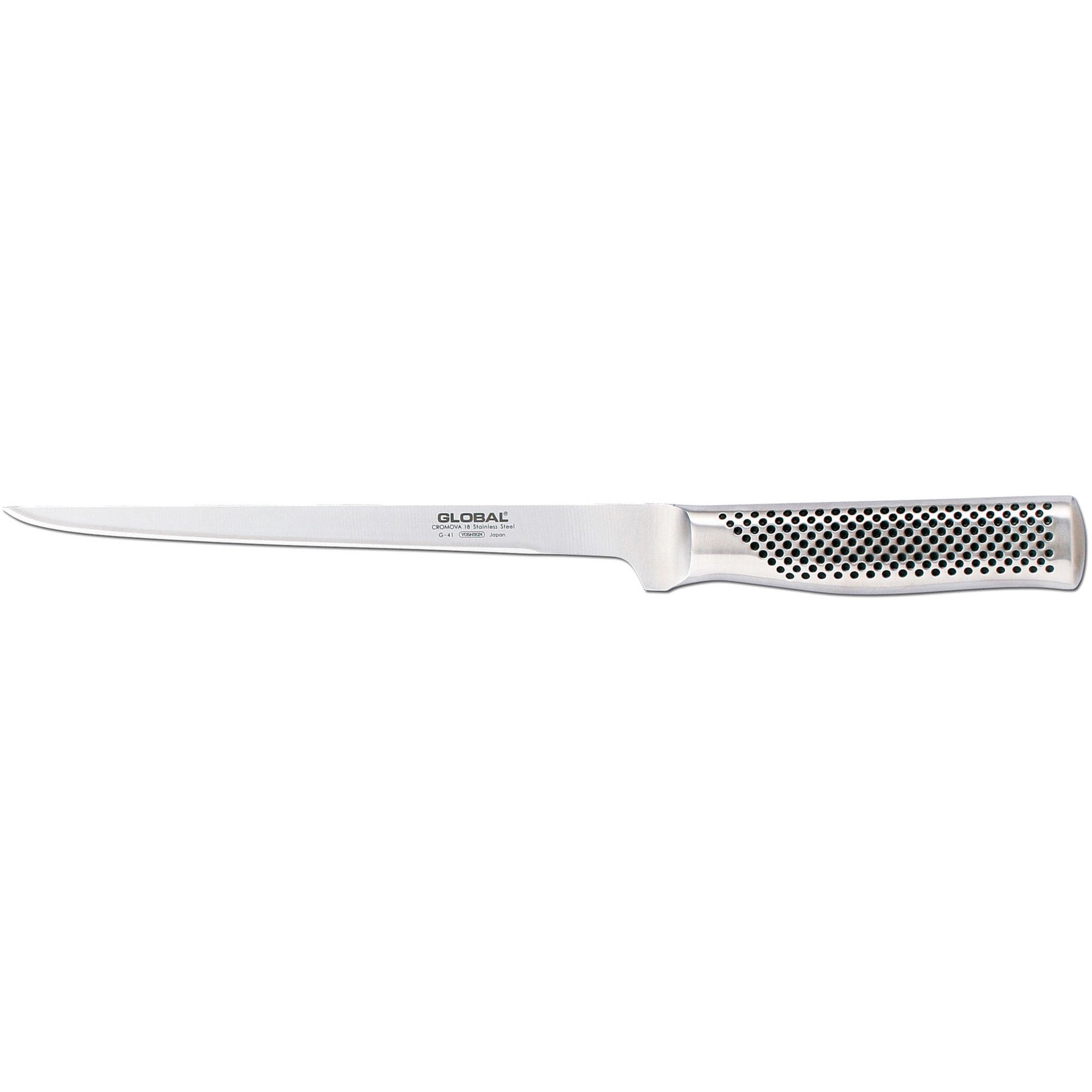 Global G-41 filetkniven er perfekt til fileteringsarbejde, da den kan komme helt tæt på benet. Den har et blad på 21 cm., og den ligger desuden særdeles godt i hånden. Kniven er et musthave til den professionelle såvel som amatørkokken, der ikke ønsker at